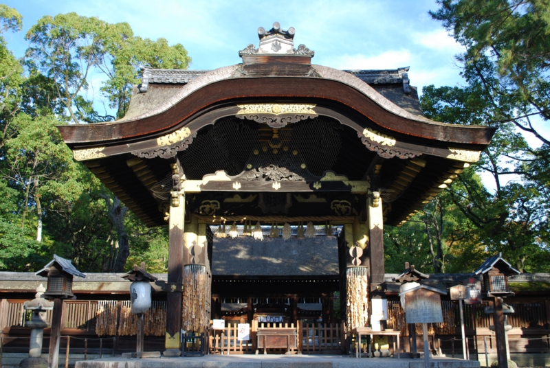 神社正面の唐門は伏見城遺構と伝わる国宝建造物。